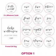 Starting with a ‘Hello World' announcement card, there is a beautifully finished card to mark each month of your baby's first year of life.